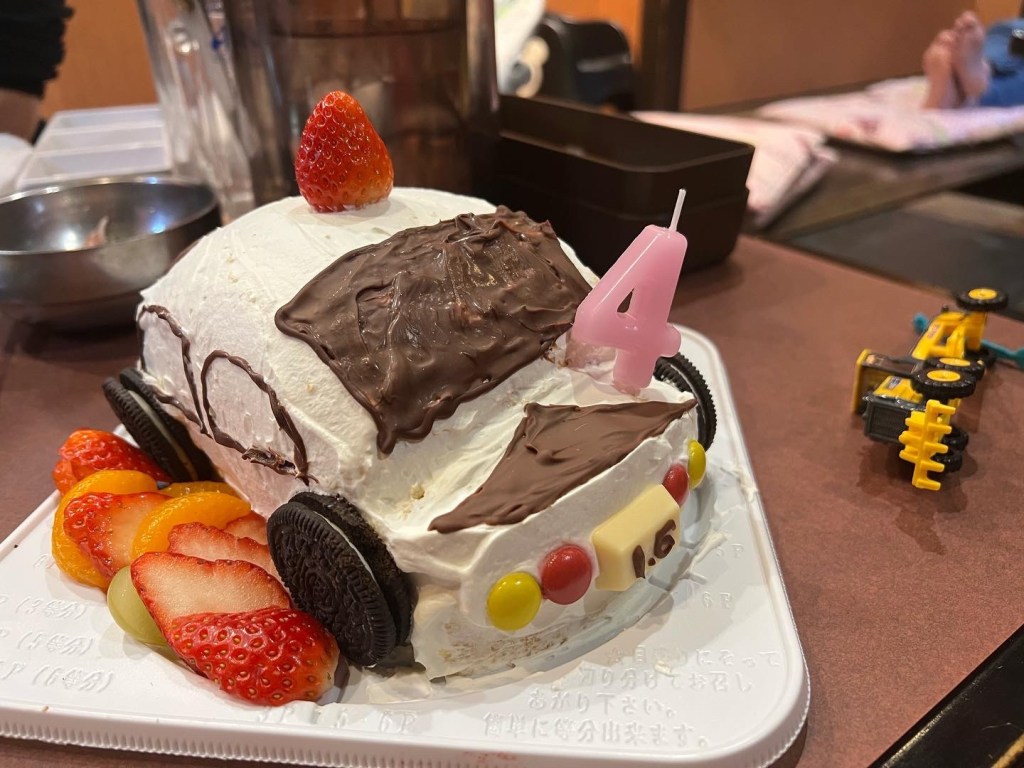 義理父の子供達(再婚)と一緒に焼肉でお祝いをし、車好きのゆっくんを喜ばせるために手作りケーキを作りました笑